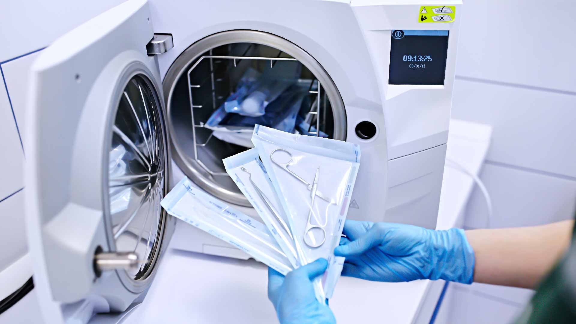 - Le turbine vengono oliate all’interno, coperte con delle garze e imbustate per poi finire in autoclave ed eseguire un ciclo di sterilizzazione a 134°C insieme a tutti i vari strumenti utilizzati durante il giorno che però ancor prima sono stati disinfettati in una vasca ultrasuoni a temperatura di 60° C, imbustati singolarmente e sigillati.